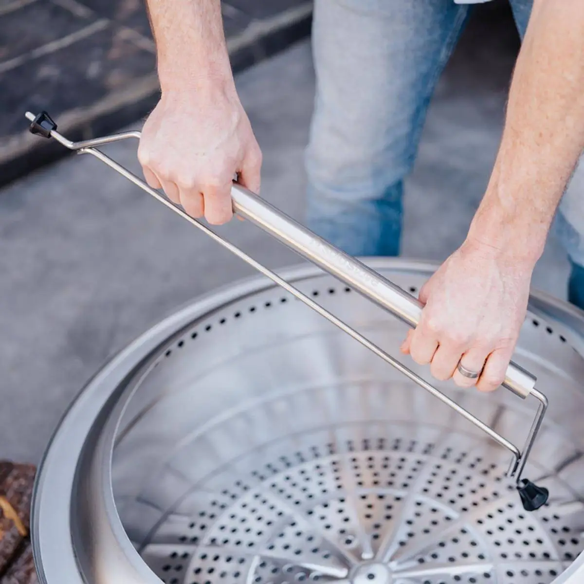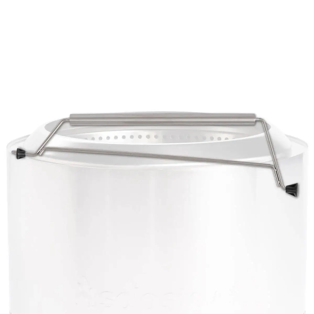 Håndtaket plasseres ned i bålpannen, og låses fast i en av lufthullene i toppen på bålpannen. Da vil andre enden presses mot veggen i bålpannen og sørge for en trygg ferd fra A til B for både deg og bålpannen.