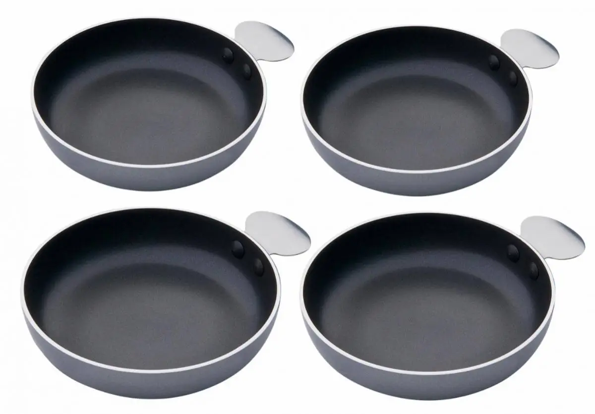 Tapassett med 4 små stekepanner i aluminium med slippbelegg.