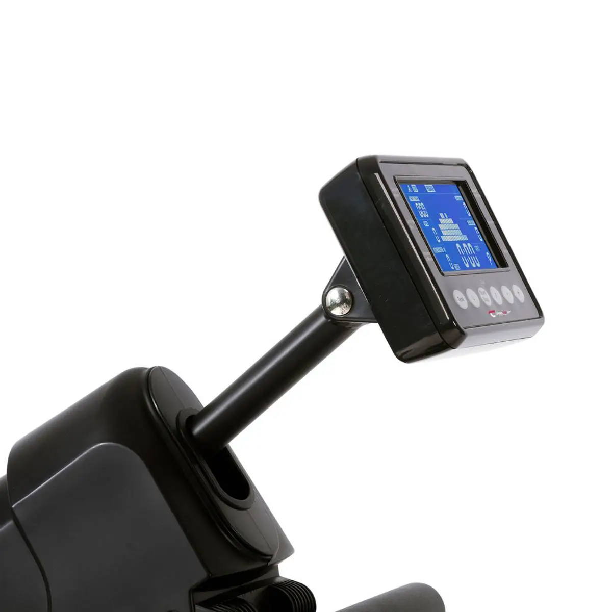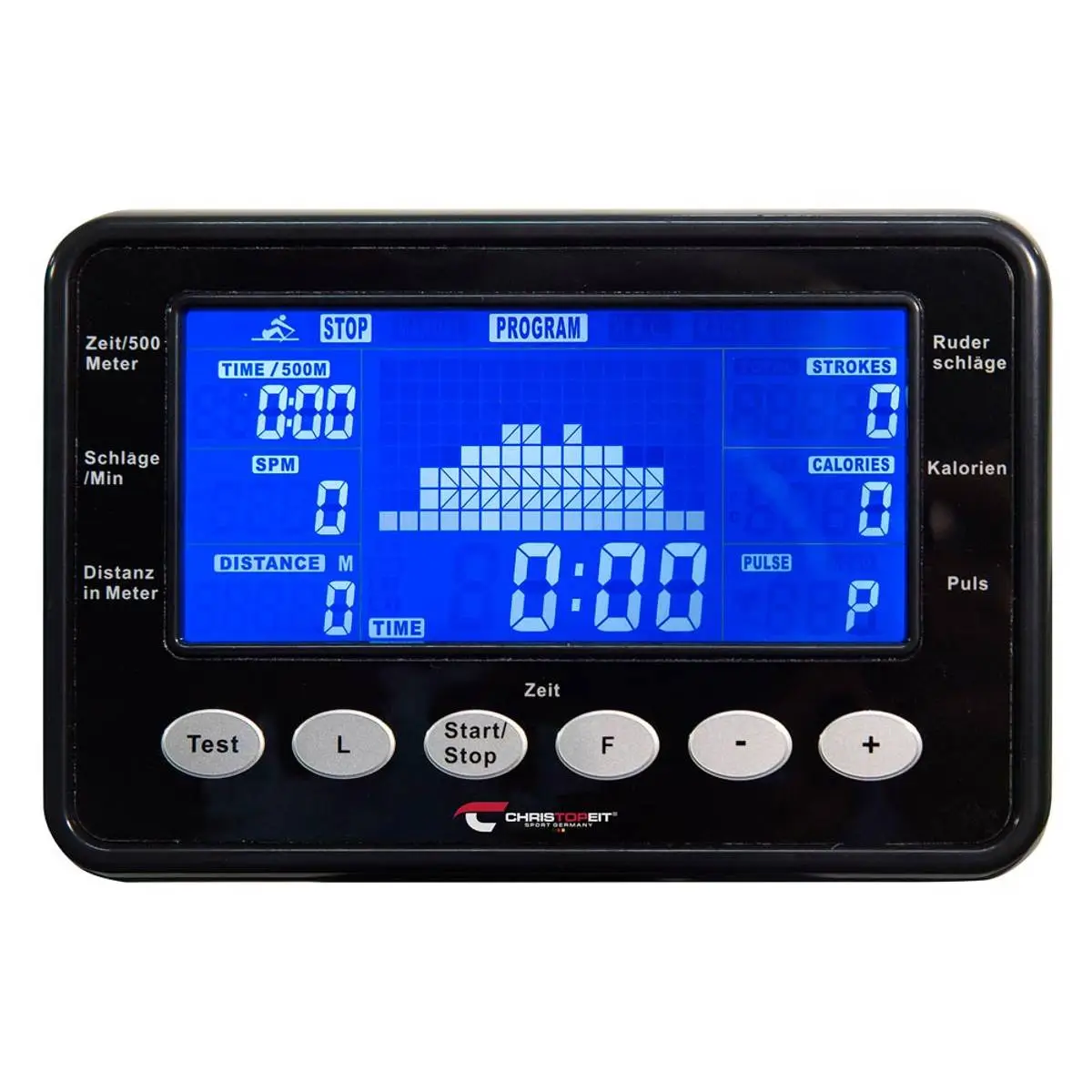 Como romaskin garanterer helkroppstrening uansett vær og i en feel-good atmosfære hjemme. Treningsapparatet adresserer nesten hele kroppsmuskulaturen. Spesielt de ofte forsømte skulder- og ryggmusklene tas opp. Også ideell for trunkøvelser. 16-trinns motor og datastyrt motstandsinnstilling av magnetbremsesystemet, den stabile og sikre snøringen og det polstrede komfortsetet med kulelagrede seteruller, som ruller lett på seterammen, muliggjør målrettet trening med en fritt valgbar belastning. Den brukervennlige datamaskinen med den blå bakgrunnsbelyste LCD-skjermen viser 7 treningsrelevante data på et øyeblikk. En variert trening kan realiseres ved hjelp av de 12 permanent lagrede treningsprogrammene. Pulsstyrt pulstrening er mulig ved bruk av et valgfritt pulsbelte (ukodet med 5,3 kHz) med forskjellig belastning i de 4 permanent lagrede pulsprogrammene. Det individuelle treningsprogrammet samt konkurranseprogrammet fullfører treningsmulighetene. En stabil fotstilling sikres av passende fotskall med borrelås. Foldemekanismen for plassbesparende oppbevaring avrunder enhetens funksjoner.