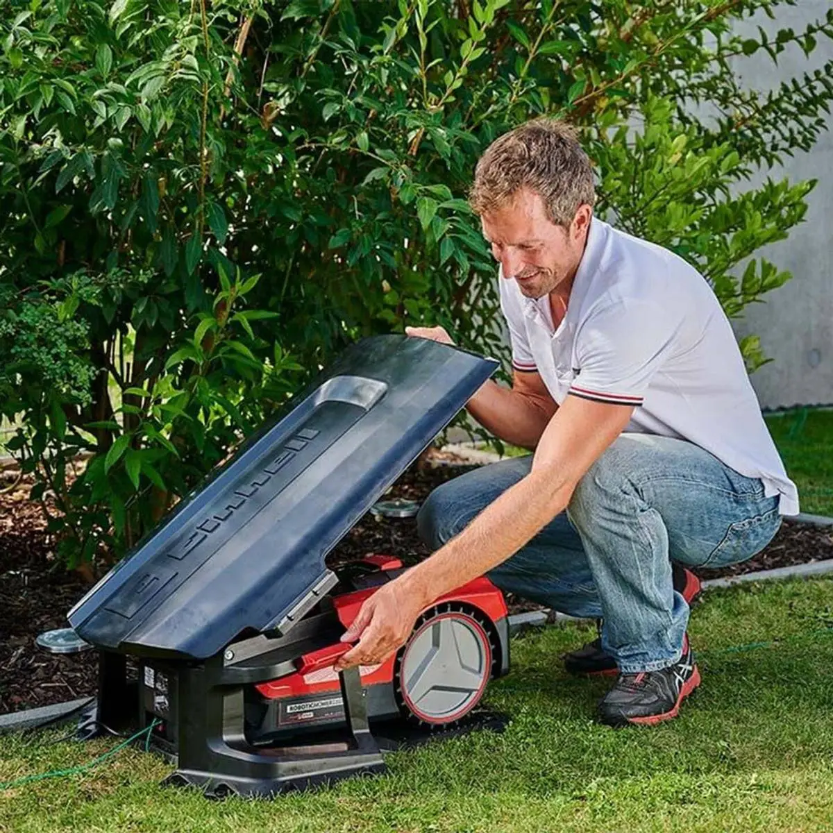 Garasjen forlenger levetiden til robotgressklipperen fordi den reduserer den ytre påvirkningen betydelig. Robotgressklipperens garasje har et hengslet deksel for enkel tilgang. Installasjonen er ganske enkel og leveres komplett med åtte festeskruer.