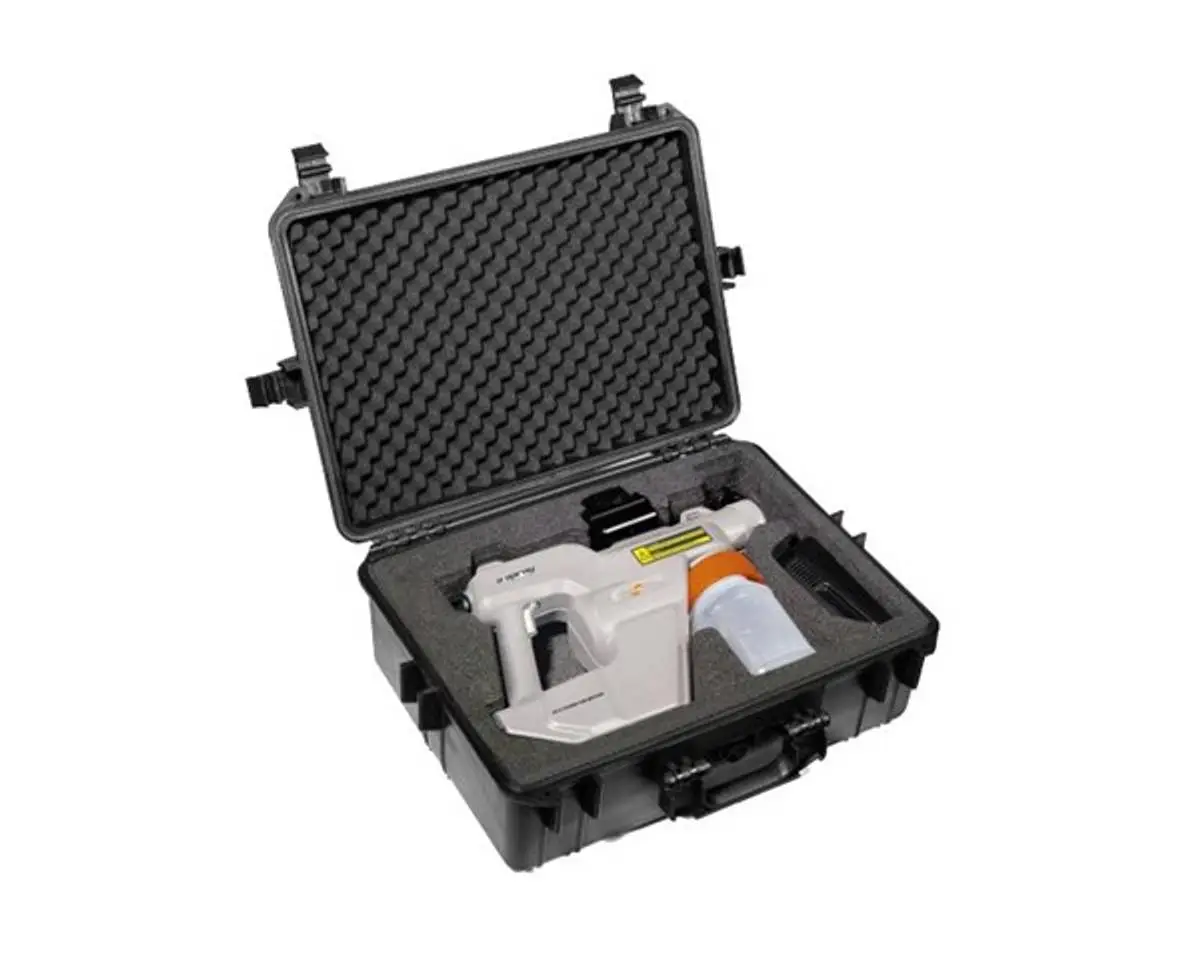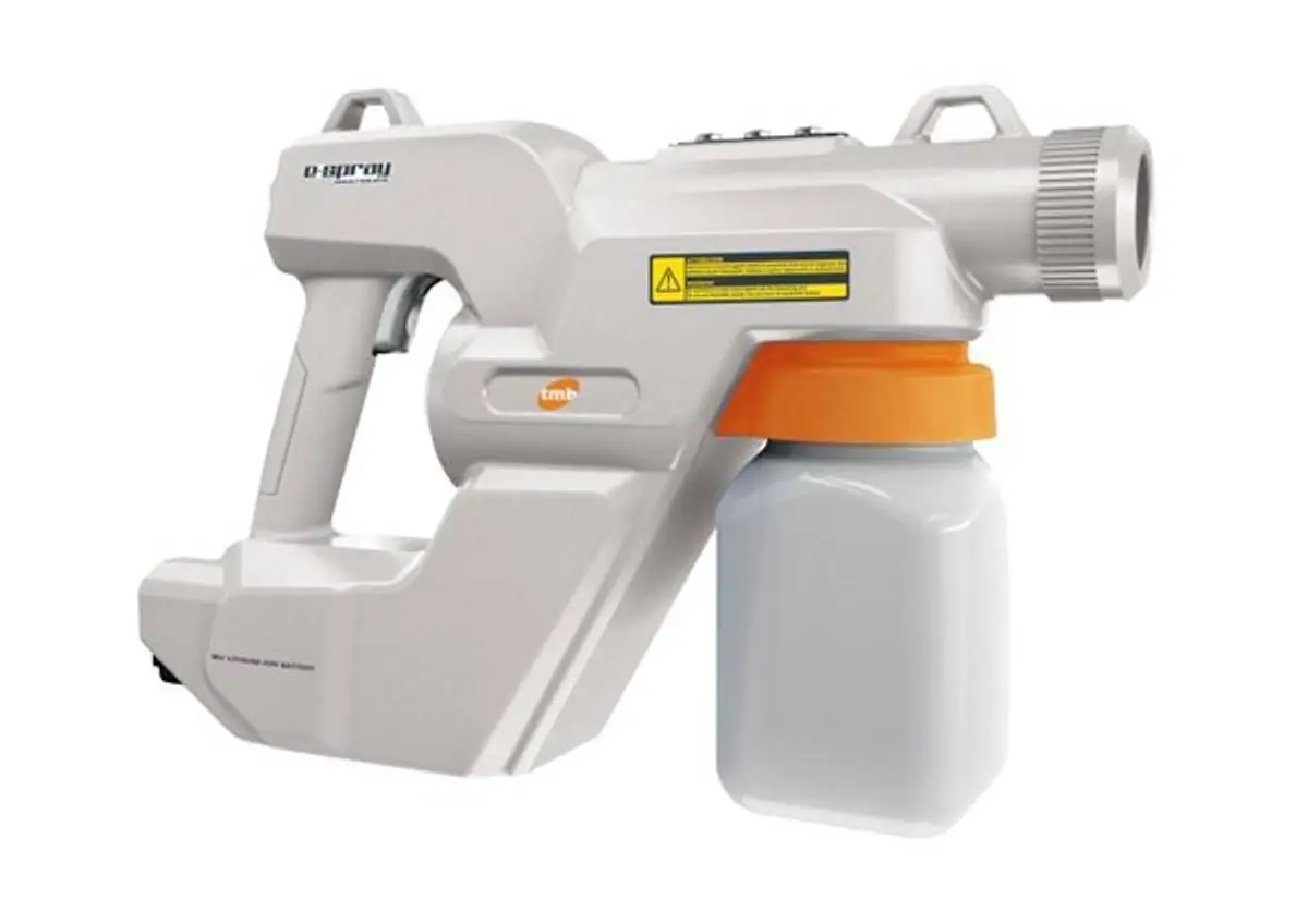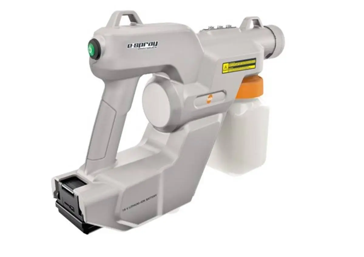 E-sprayer en håndholdt, litium-batteri drevet enhet med enestående dekning av elektrostatisk ladet diffusjon. Desinfeksjonsløsningen blir elektrostatisk ladet og diffunderes i en mikronisert spray med veldig fine partikkelstørrelser. Denne elektrostatiske ladningen gjør at desinfeksjonsmiddelpartikler tiltrekker seg til alle overflater og overvinner tyngdekraften som kan forårsake at desinfiserende partikler faller unyttig på bakken. Dette sikrer en perfekt tredimensjonal teppedekning av alle overflater. E-spray er laget med antibakteriell plast