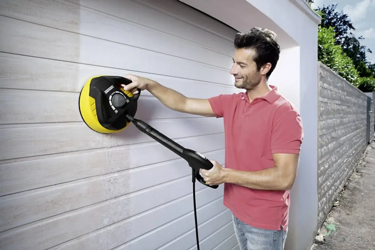 T 350 terrassevasker kan rengjøre store overflater raskt og effektivt helt sprutfritt. Den er enkel å manøvrere, og har håndtak for vertikale flater som gjør det enklere å rengjøre for eksempel garasjeporten. Med trykkregulering på toppen av vaskeren, er det enklere å tilpasse trykket for ulike underlag. T 350 passer med Kärcher Home & Garden høytrykkspylere K 2 – K 7.