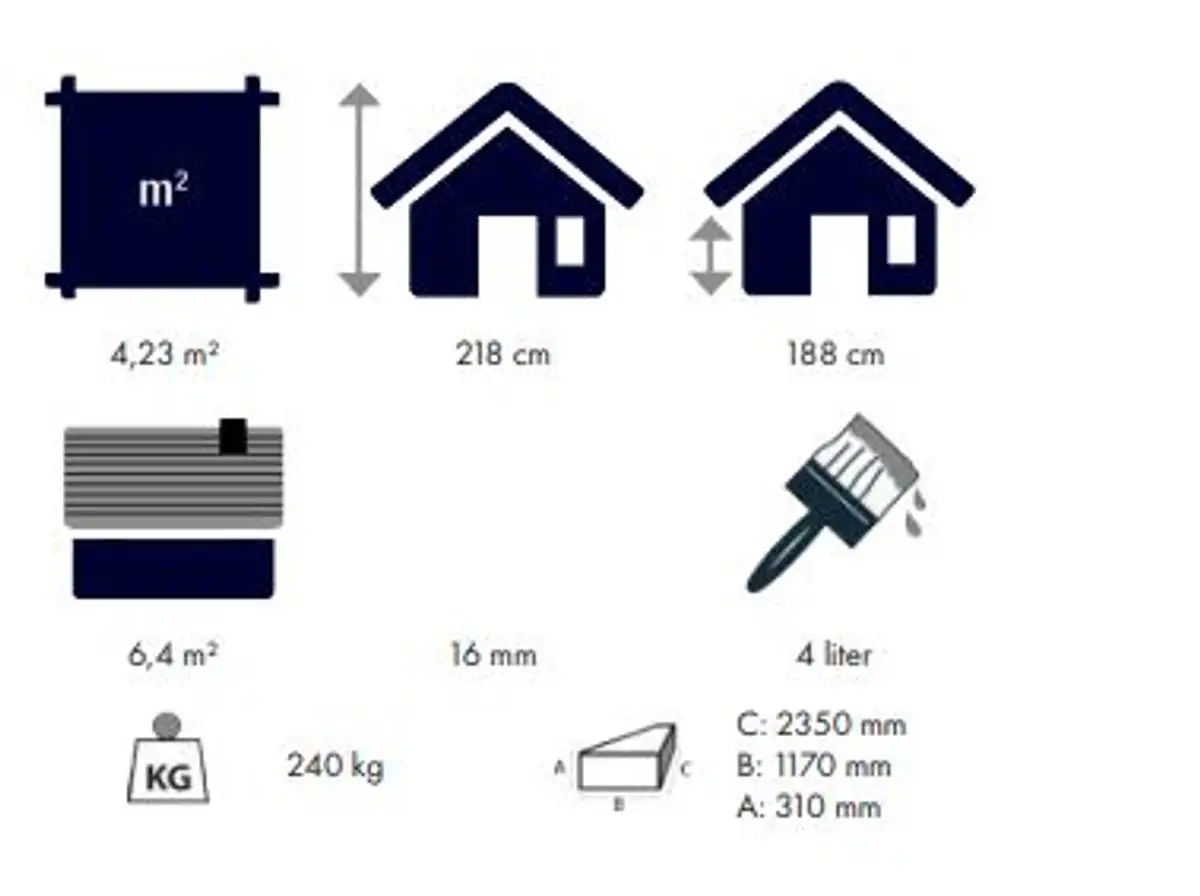 Leveres med alt av festemateriell, taktro og gulv.