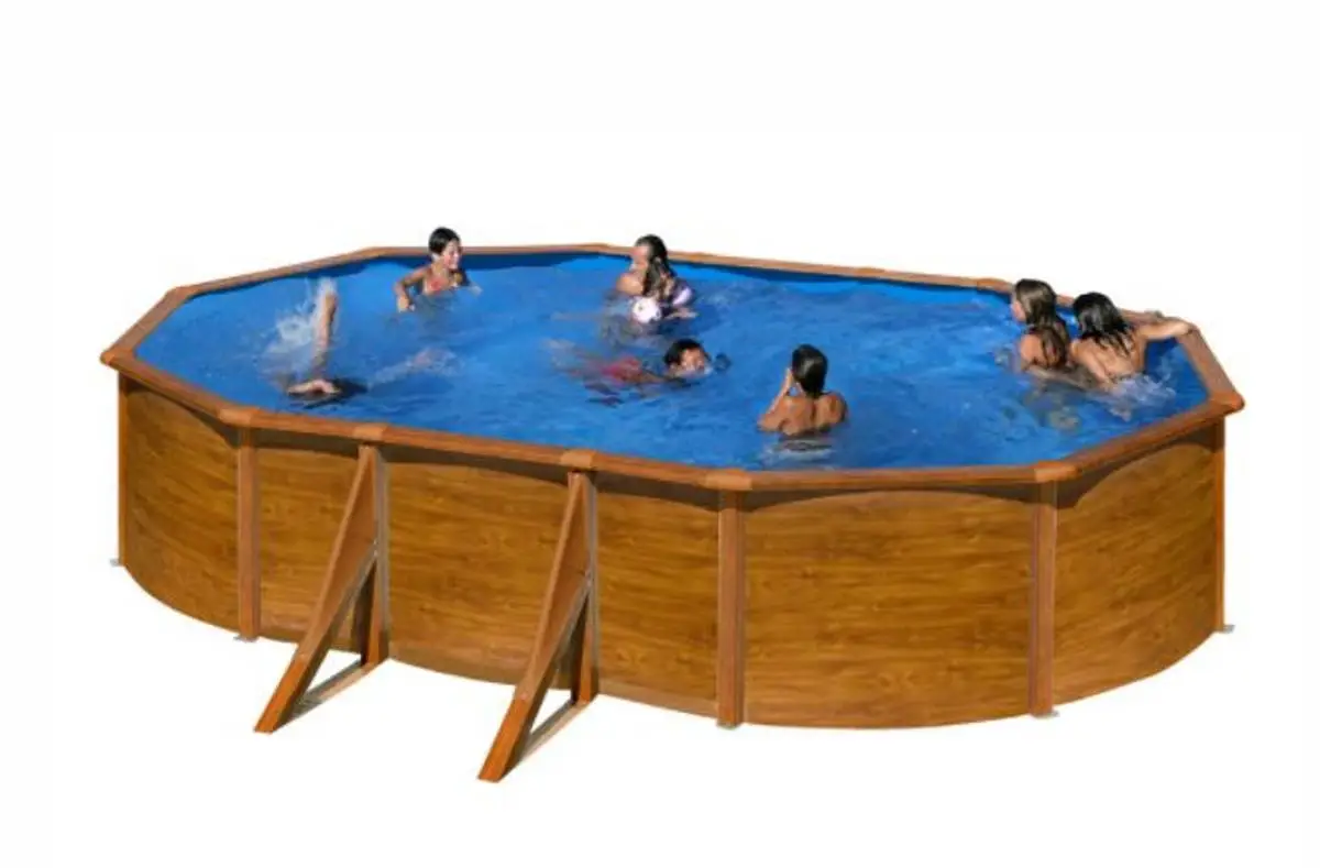 Bassengveggen har en påtrykt imitasjon av ekte tre som er lakkert for ikke å falme i tide.