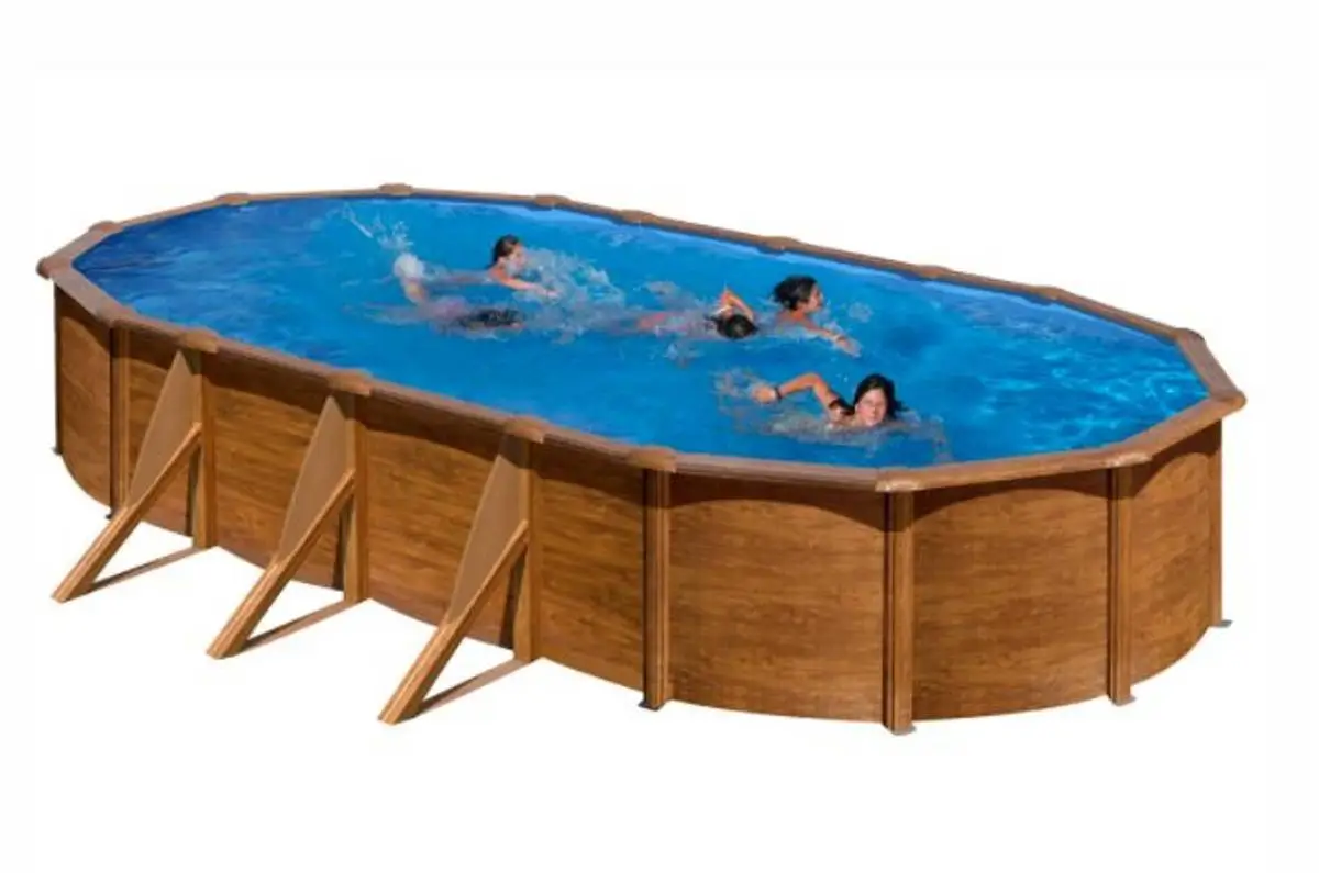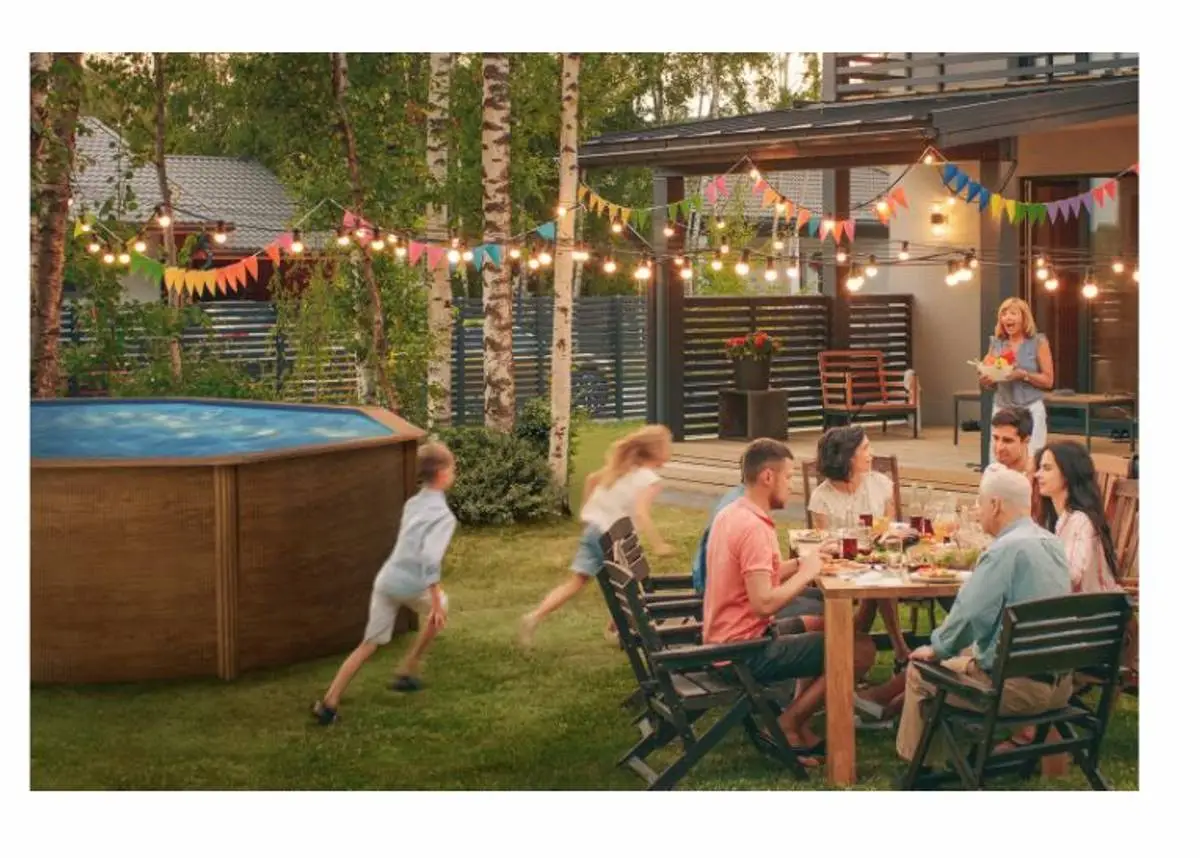 Kvalitetsbasseng med imitert tre på veggene, noe som gjør at bassenget passer godt inn i et romantisk hagemiljø.