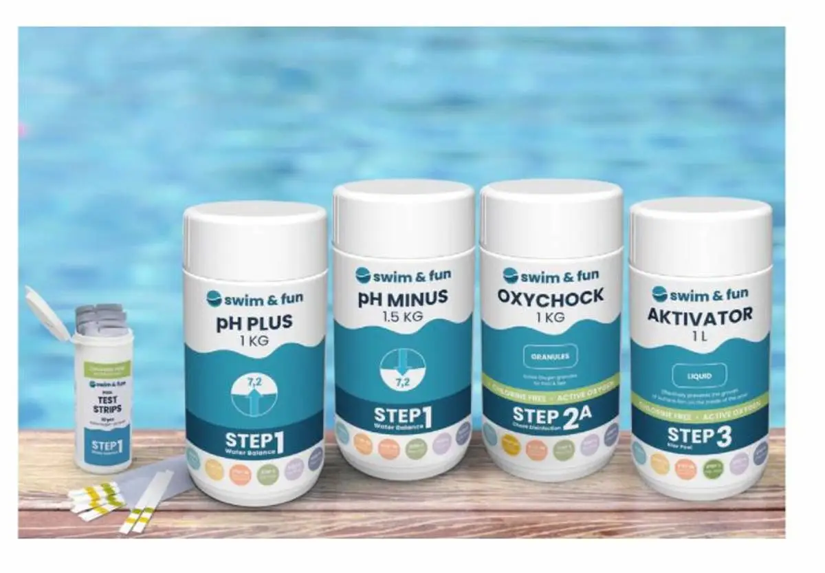 I tillegg inneholder settet pH-Plus og pH-Minus, som brukes til å justere pH-nivået, og Aktivator, som forlenger og øker desinfeksjonseffekten.