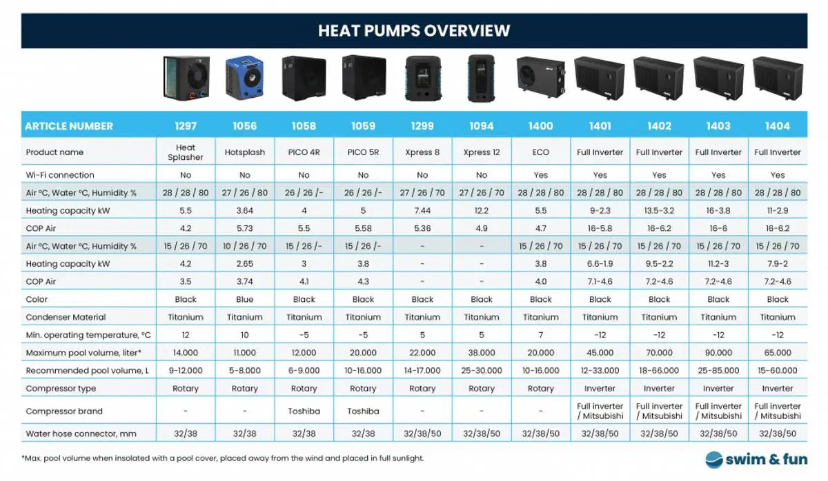 Varmeveksleren er laget av PVC- og titanrør som tåler vedvarende eksponering for bassengvann – med både klor og saltvann, og er utstyrt med en GMCC / Mitsubishi kompressor.