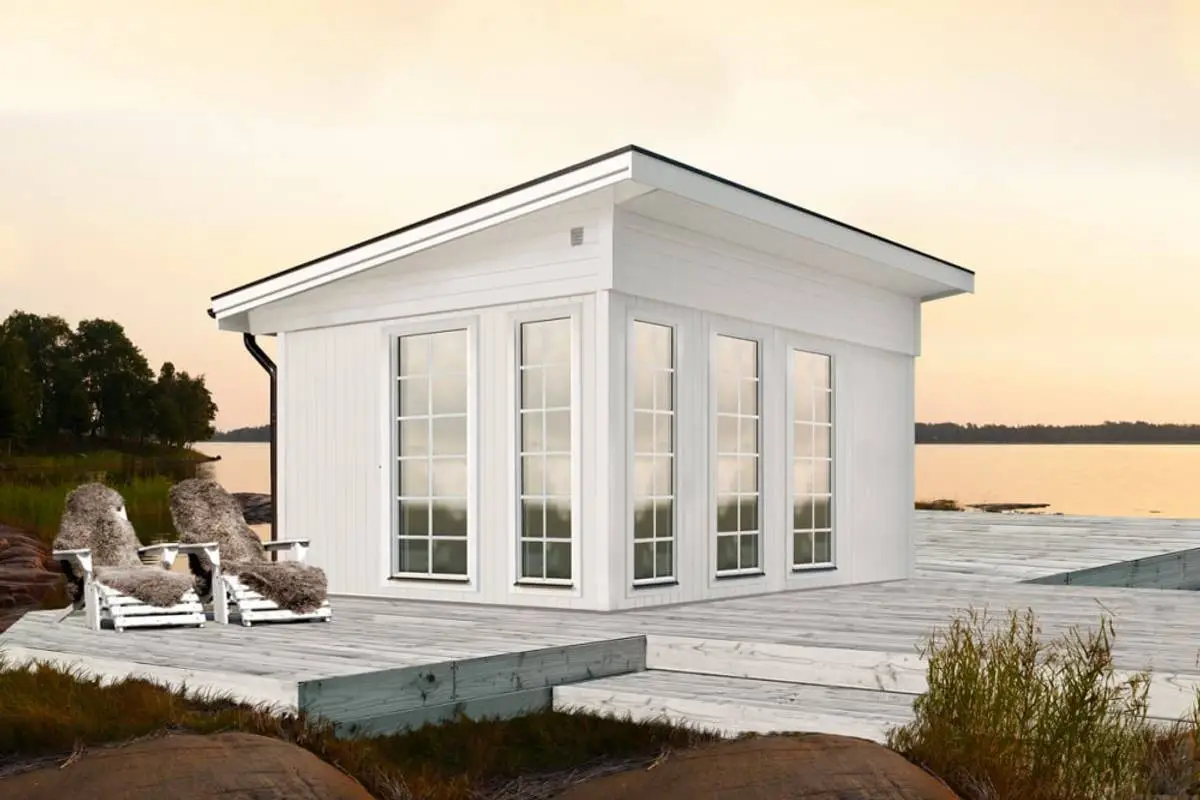Vibo Ellinor 15 leveres som et sett med ferdige veggmoduler og endespisser.
