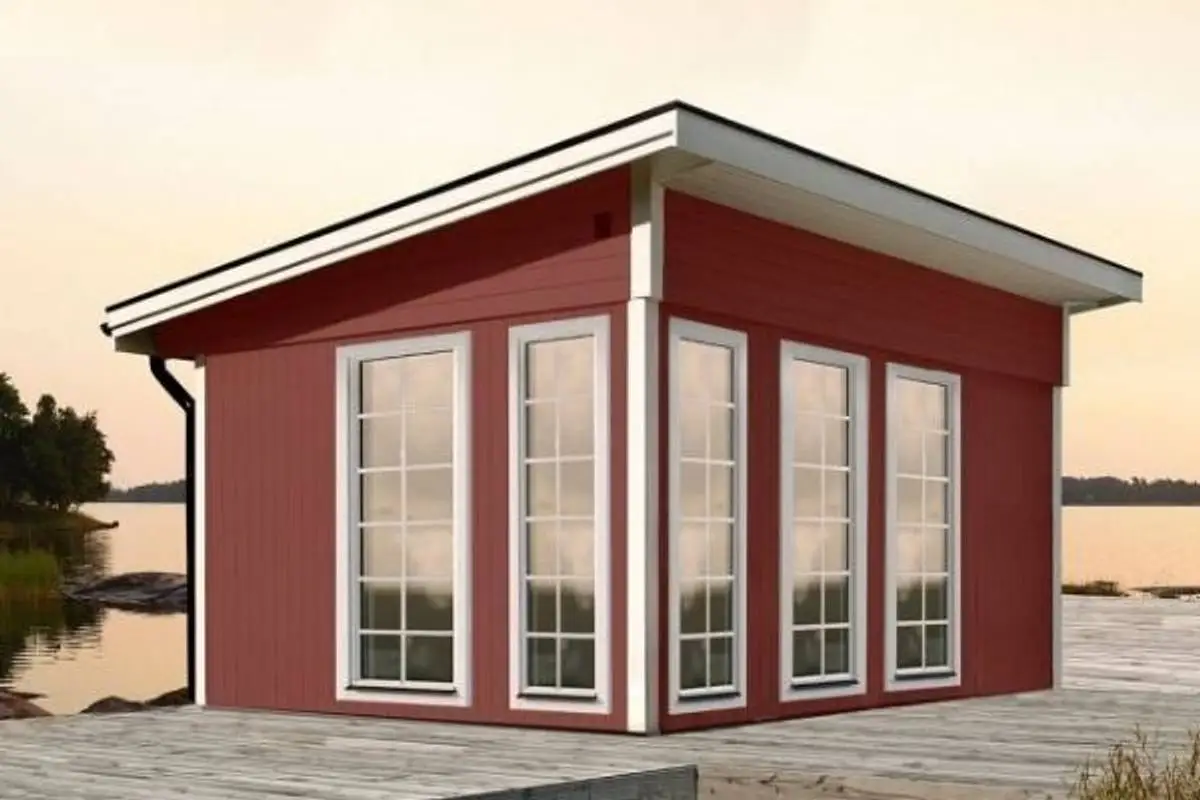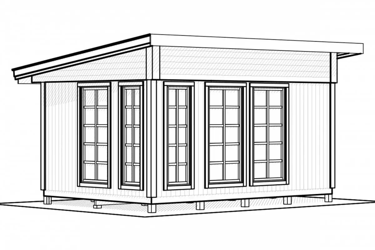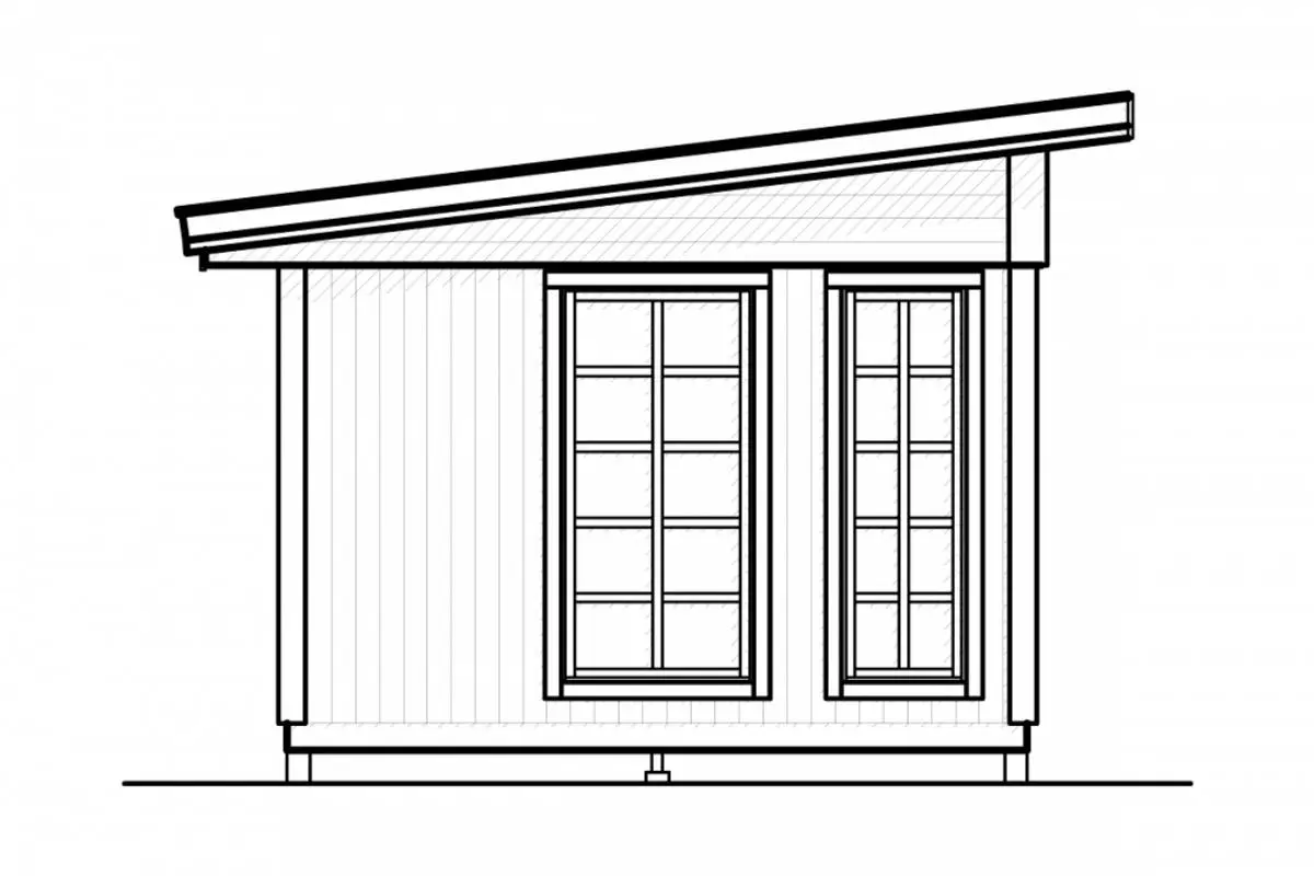 Vibo Ellinor 15 er en frittstående bod som leveres som byggesett med ferdige veggmoduler og gavler .