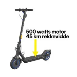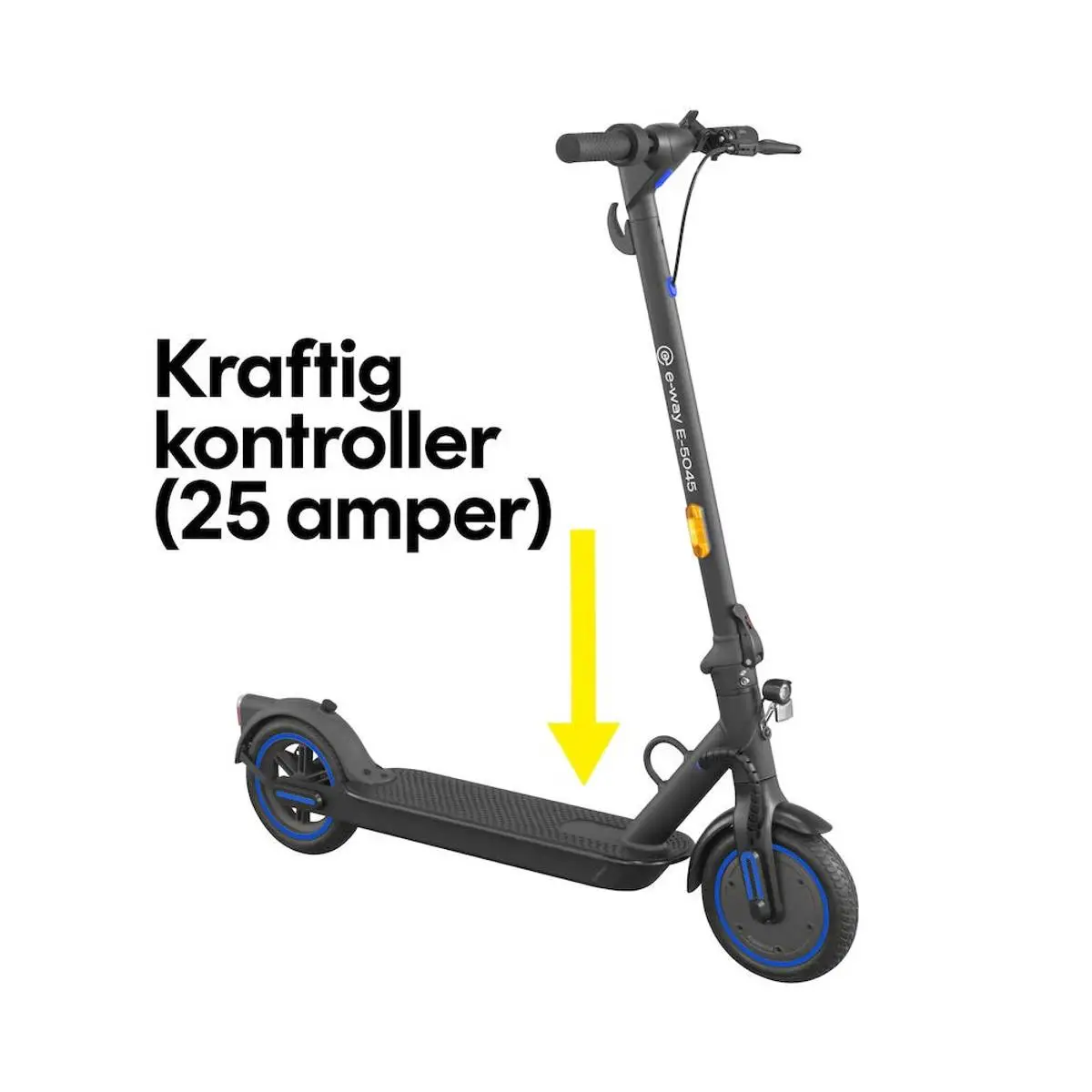 Den elektriske sparkesykkelen E-Way E-5045 kommer med en 500 watts motor, 1000 watt maks effekt, og kan kjøre opptil 45 km per ladning. E-5045 er kraftig nok til å kjøre opp bakker med 25 % stigning. Ta i betraktning at vekten til personen vil påvirke ytelsen til den elektriske sparkesykkelen.