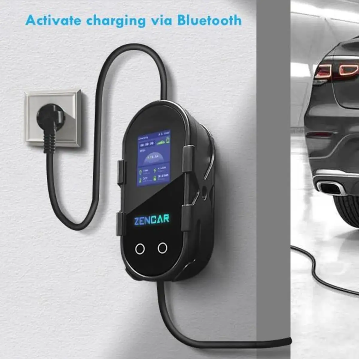 Bluetooth for styring fra telefon, dvs du kan starte/stoppe lading fra telefon via bluetooth. (Begrensning på avstander i forhold til blutooth). Den leveres i tillegg med en adapter slik at du kan benytte 32 A 1-fas Blå CEE kontakt. Da kan du lade opptil 7.4 kW på 1-fas 230 V IT nett. Alt leveres med en solid bag for oppbevaring.